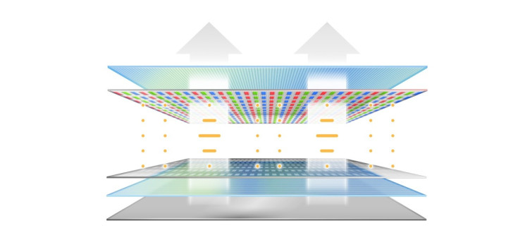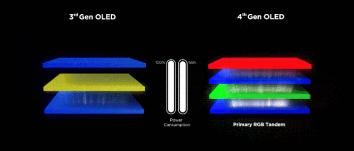 第四代 WOLED 之所以能大幅提升亮度和延长寿命,核心在于一项名为 "Primary RGB Tandem" 的全新技术。与LG第三代 WOLED 面板的“蓝-黄-蓝”三层发光层结构不同,LG 的第四代面板将其中的黄色发光层拆分为独立的红色和绿色发光层,从而形成了“红-蓝-绿-蓝”四层堆叠。这种设计的关键在于,它将发光器件以串联方式叠加,能实现更高的效率、更长的寿命和更高的亮度,真正解决了 OLED 面板长期以来在亮度和寿命上的挑战。