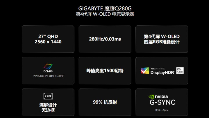 技术进步最终要靠数据说话。技嘉新款的MO27Q28G,作为首批采用第四代WOLED技术的游戏显示器,其官方参数便直接印证了上述技术带来的巨大提升。根据官方数据,这款显示器的峰值亮度可以达到1500尼特,DCI-P3色域覆盖率达到99.5%,并通过了VESA DisplayHDR True Black 500认证。远超过去的WOLED面板。